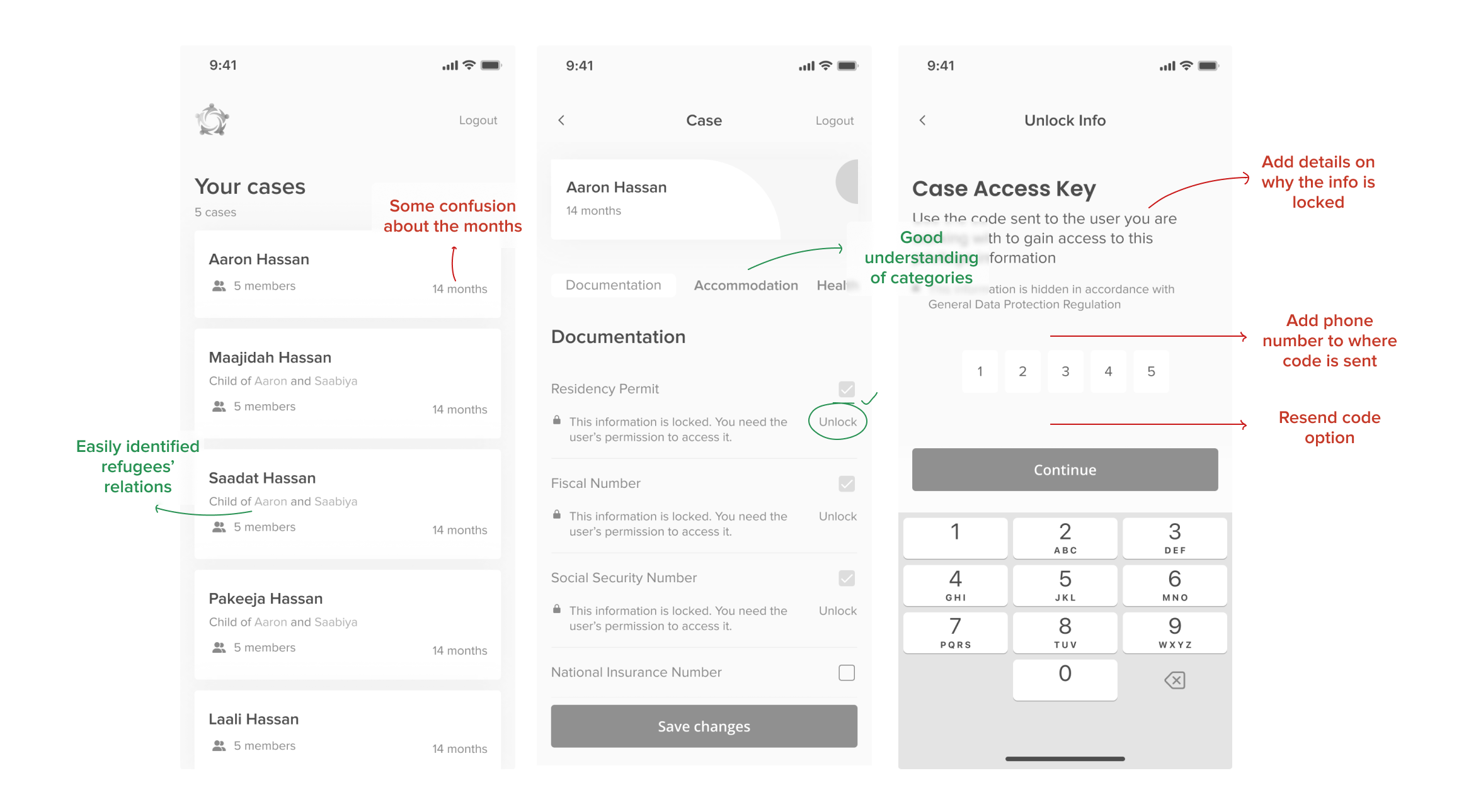 Stakeholders and Host Instituitons’ Managers mentioned the importance of protecting Migrants' sensitive information while still having it accessible by the Volunteers when needed. To add an extra layer of security, the team created a two-device authentication system, allowing Volunteers to consult private information for 2-hours with a Case Key sent to the Migrant's device.