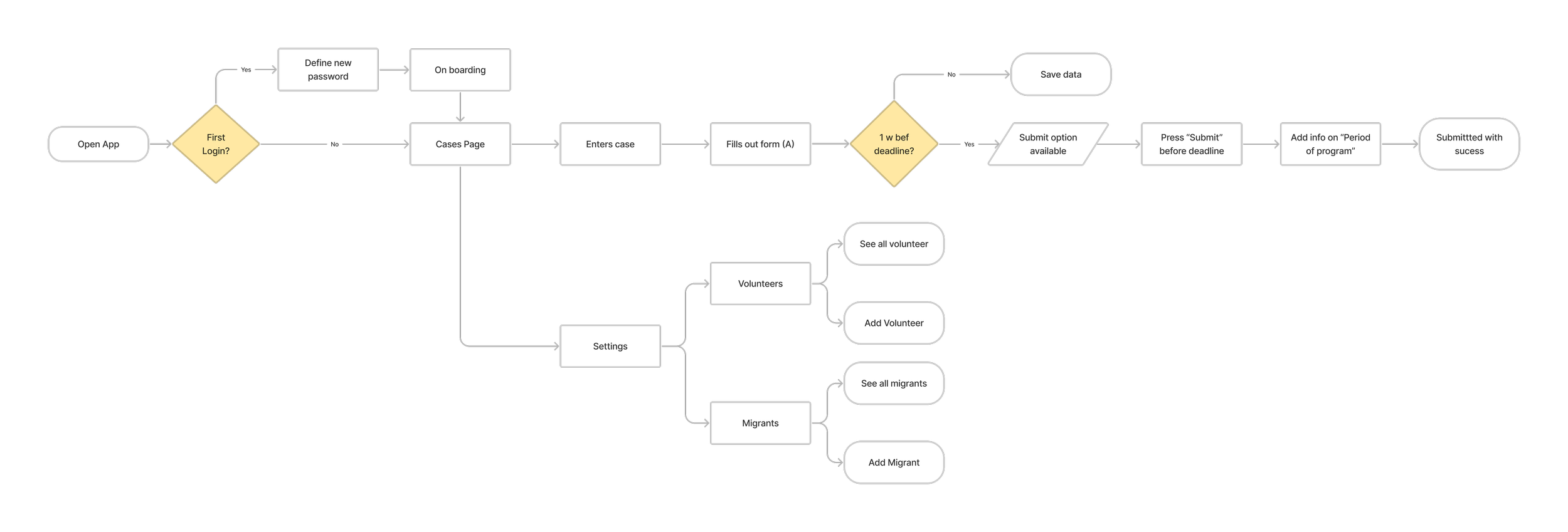 From here I defined the goals of the project: centralize and streamline the reporting process, keep personal data confidential, manage submission deadlines, and empower refugees to submit their own reports.